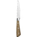Rustikale Ausführung. Griff aus Rosenholz, glatte Klinge, Schneide Aisi 420 (chromlegierter, nichtrostender Stahl). NICHT spülmaschinengeeignet.