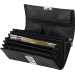 Kalbsnappaleder schwarz, hohe Qualität. Schlüsselkette mit Karabinerhaken. Münzfach mit Leder abgefüttert. Bestehend aus: 1x Münzfach, 5x Scheinfach, 1x schmales Scheinfach, 1x Reißverschlussfach, 1x Steckfach an der Rückseite. Weiche Haptik.