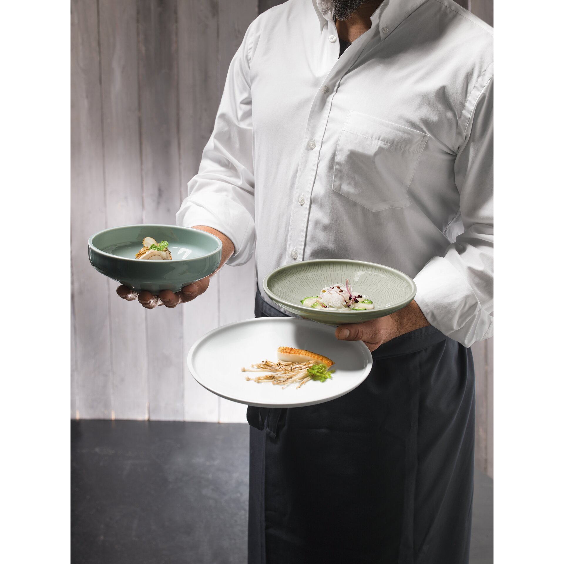SHIRO GLAZE gibt dem kühlen, skandinavischen Design der Form einen emotionalen Touch. Durch den von Artikel zu Artikel wechselnden, leicht wolkigen Charakter der Farbglasuren entsteht eine lebhafte handwerkliche Optik. Die pastelligen Farbnuancen FROST und STEAM harmonieren bestens miteinander. Reizvolle Kontraste bringt das Zusammenspiel von reliefierten mit glatten Teilen ins Spiel.